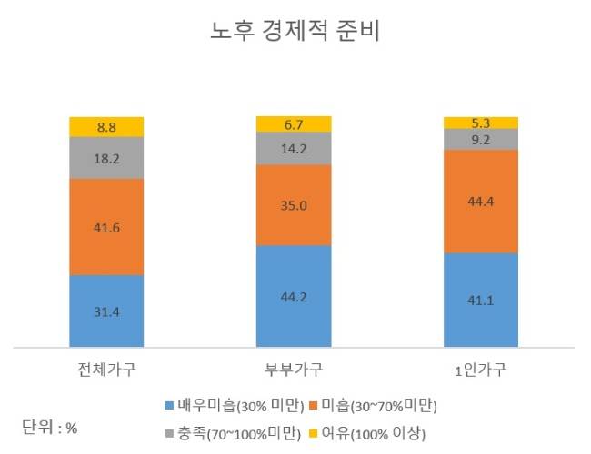 적정생활비의 70% 이상을 준비해둔 비율도 부부 가구는 20.9%, 1인 가구는 14.5%에 그쳤다.