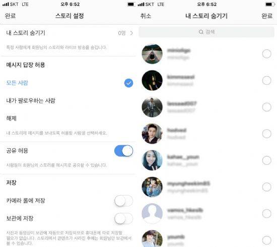 본인이 게시한 스토리를 특정사람이 보지 못하게 하려면 스토리를 숨길 수 있다. 프로필 상단의 옵션을 눌러 계정메뉴 아래 ‘스토리설정’을 선택하면 스토리를 특정 사람에게 숨길 수 있다. 같은 메뉴에서 스토리를 다른 사람들이 메시지 공유할 수 있는지에 대한 허용여부도 설정할 수 있다.