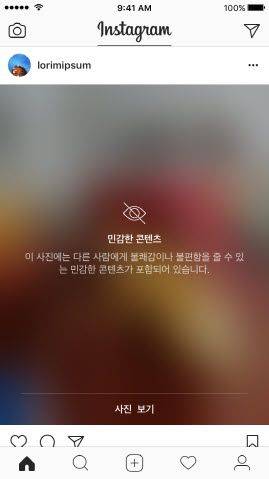 민감한 콘텐츠가 포함된 사진과 동영상의 경우, 사용자가 해당콘텐츠를 보기 전에 미리 알 수 있도록 경고문구가 표시될 수 있으며, 피드의 게시물이나 다른 사람의 프로필을 볼 때도 표시된다.
