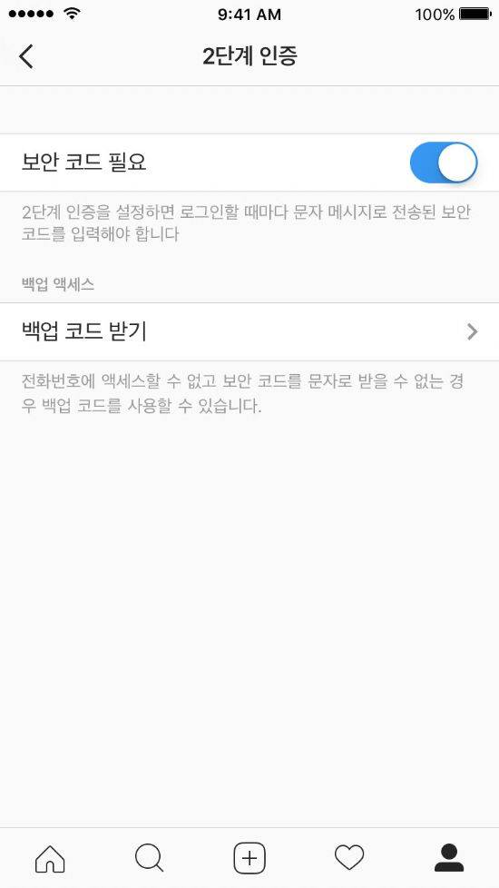 강력한 로그인 인증방법으로 인스타그램 계정이 도용되는 위험을 방지하는 기능이다. 이전에 등록된 기기가 아닌 알 수 없는 기기에서 인스타그램에 로그인할 때마다 사용자 이름 및 비밀번호와 함께 SMS 보안코드, 백업코드를 추가로 입력하라는 메시지가 표시되도록 한다.