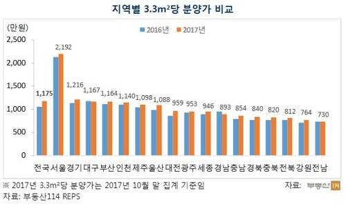 2017년 전국 기준 3.3㎡당 평균 아파트 분양가격은 1천175만원으로 2016년 1천52만원 대비 123만원 높아졌다.