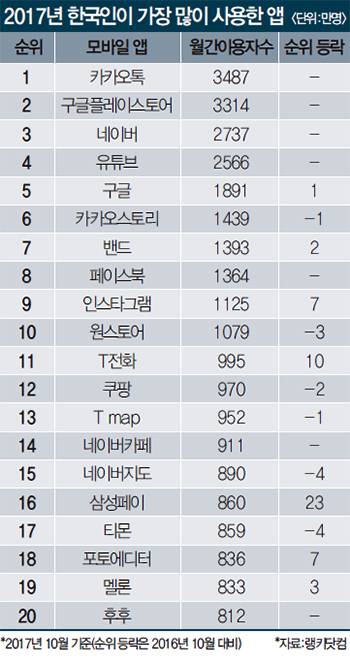 2017년에 국내 ‘엄지족(스마트폰 사용자)’에게 사랑받은 ‘올해의 앱’은 무엇일까. 매경이코노미는 시장조사업체 랭키닷컴에 의뢰해 지난해와 올해 월간이용자수(MAU)가 가장 많았던 앱 상위 300개를 비교 분석했다.