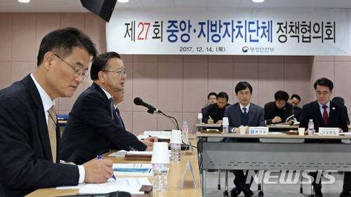 【서울=뉴시스】 김부겸 행정안전부 장관이 14일 오후 경북 포항 죽도동 주민센터에서 열린 제27회 중앙지방 정책협의회에서 인사말을 하고있다. 2017.12.14. (사진=행정안전부 제공)