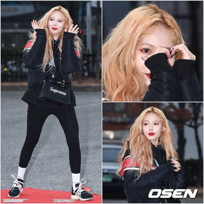 현아가 출근길에서 포즈를 취하고 있다./ soul1014@osen.co.kr
