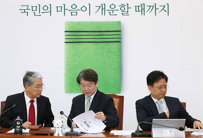 | ▲ 때수건 내건 국민의당 "국민의 마음이 개운할 때까지" 국민의당 안철수 대표(가운데)와 김동철 원내대표가 15일 국회 당대표실에서 열린 최고위원회의 도중 대화하고 있다. 안철수 대표실이기도 한 이날 회의장에는 '때수건' 이미지와 함께 "국민의 마음이 개운할 때까지"라는 문구가 내걸렸다. |