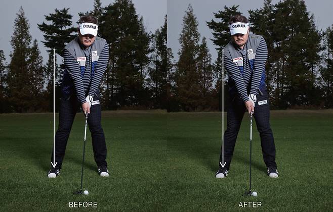 → 어드레스 시 체중이 왼쪽으로 치우치고 어깨도 닫혀 있어 낮은 슬라이스를 유발한다.