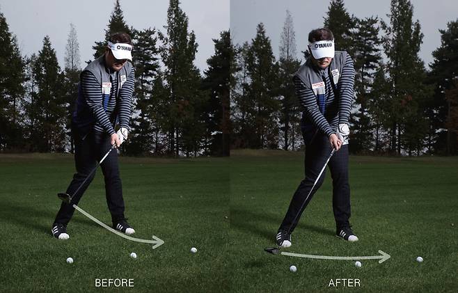 → 임팩트 순간 상체가 앞서나가고 아웃에서 인으로 클럽이 이동한다.