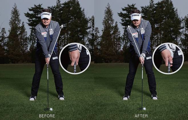 → 오른손이 그립을 덮어 잡으면 임팩트 순간 헤드 페이스가 열려 맞게 된다.