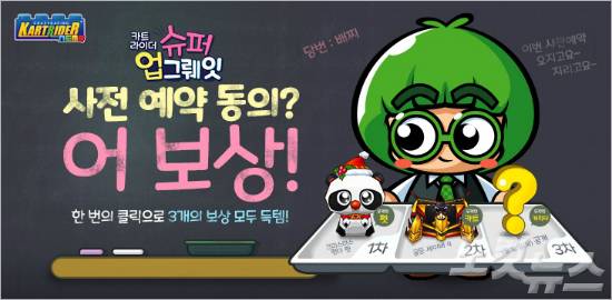 ㈜넥슨(대표 박지원)은 인기 캐주얼 레이싱게임 ‘크레이지레이싱 카트라이더(이하 카트라이더)’의 2017 겨울 업데이트 ‘슈퍼업그뤠잇’을 앞두고 사전예약 참가자를 14일부터 모집한다.