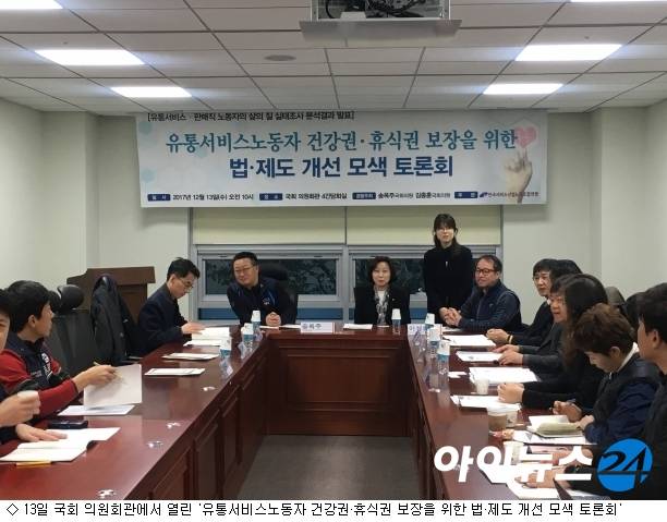 송옥주 더불어민주당 의원과 김종훈 민중당 의원이 13일 국회 의원회관에서 공동주최한 '유통서비스노동자 건강권·휴식권 보장을 위한 법·제도 개선 모색 토론회'에서 김종진 한국노동사회연구소 연구위원은 이같은 내용의 유통 서비스·판매 노동 실태 조사 및 분석결과를 발표했습니다.