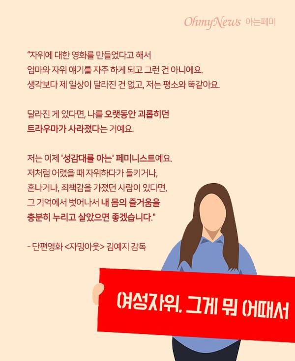 "제가 여성학 수업을 들었는데, 교수님께서 스스로의 몸을 탐구해 본 적이 있냐고 물어보셨어요. '현재의 섹스는 삽입중심적인데 이건 남성의 시선에서 바라본 거지 여성이 즐기는 섹스라고 할 수 없다, 여성 스스로도 섹스를 즐기는 방법을 알 수 있어야 하는데 그러려면 자위를 해보는 게 가장 좋다' 이런 이야기들을 하셨어요.
