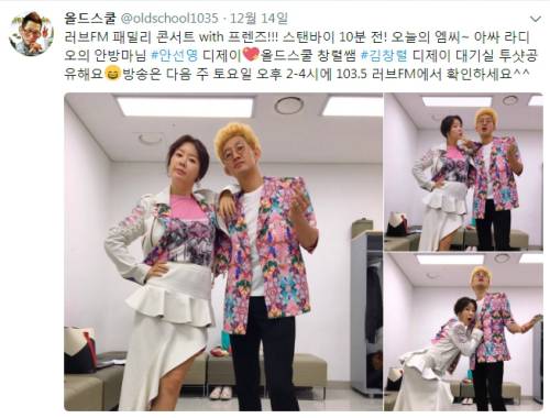 지난 14일 '김창렬의 올드스쿨' 측은 트위터(아래 사진)에도 "김창렬 디제이 대기실 투샷 공유해요"라고 소개하면서 방송인 안성과 함께 찍은 사진을 공개했다.