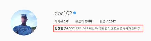 그는 인스타그램 프로필에 "김창열(DJ DOC) SBS 103.5 러브FM '김창열의 올드스쿨' 함께해요"라는 글(아래 사진)을 남겼다.