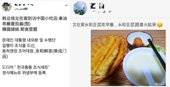 중국 최대소셜미디어 '웨이보'에는 "한국 대통령 조식 세트가 위생부에 등록됐다"는 소식과 함께 직접 먹는 인증샷을 올렸다.