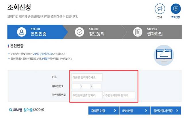 먼저 인터넷·모바일을 통해 '내보험 찾아줌', '숨은보험금'을 검색한 뒤 주민등록번호, 이름, 본인명의 휴대전화 번호를 입력하고 본인인증 절차(휴대전화, 공인인증서, 아이핀 인증 중 하나)를 거치면 된다.