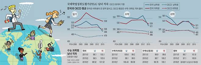 본지가 지난 2011~2018학년도 수능 표준점수 남녀 평균을 비교한 결과, 여학생들은 국어·영어 영역에서는 한 해도 빠짐없이 남학생을 앞질렀다. 2014학년도부터는 수학에서도 여학생이 남학생을 앞지르는 추세가 이어지고 있다. 최근 치러진 2018학년도 수능에선 국어와 수학나형에서 여학생이 남학생을 앞질렀다. 우리나라 여학생들은 또 72개국이 참여한 '2015 국제학업성취도평가(PISA)'에서도 읽기·수학·과학 전(全) 영역에서 남학생들을 앞질렀다. 학교 내신 경쟁에서 주눅이 든 남학생들이 남녀공학 학교를 기피하는 현상도 뚜렷하다. 서울의 한 남녀공학 고교 교장은 "전교 10등까지 중에 남학생은 1~2명밖에 없다"고 말했다.