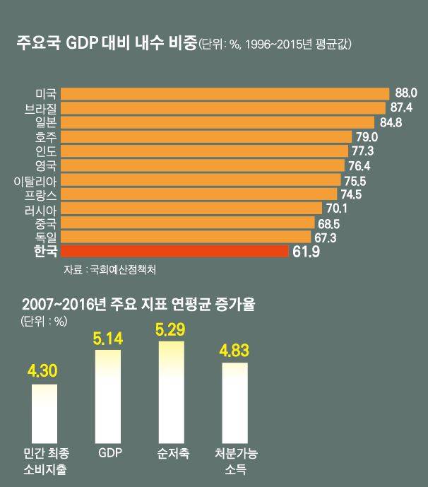 무엇보다 가계소득 정체에 따른 민간소비 둔화가 두드러지고 있다. 실제로 국내 명목 GDP가 최근 10년(2007~2016년)간 연평균 5.14% 증가한 데 비해 소비 지출의 토대가 되는 국민처분가능소득은 4.83% 늘어나는 데 그쳤다. 같은 기간 민간 최종소비지출 증가율도 연평균 4.30%에 머물렀다. 가계부채 상환 부담, 노후대비를 위한 저축 증가, 고용불안, 소비심리 악화 등으로 인해 가계가 ‘씀씀이’를 줄이고 있기 때문으로 풀이된다. 박진 한국개발연구원(KDI) 교수는 “특히 외환위기(IMF) 이후 고용이 불안한 비정규직 일자리가 크게 증가하며 가계의 소득과 소비가 정체되고 있다”고 밝혔다.
