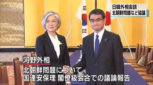 | ▲ 강경화 외교장관과 고노 다로 일본 외무상의 회담을 보도하는 NHK 뉴스 갈무리. |