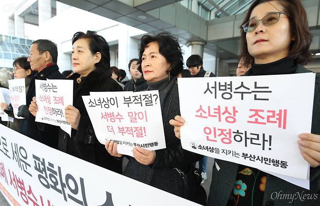 | ▲ 서병수 부산시장이 일본 영사관 앞 소녀상을 불법이라고 표현했다는 일본 언론의 보도가 나오면서 시민단체들이 비판의 목소리를 내고 있다. 소녀상을 지키는 부산시민행동은 19일 오전 부산시청 앞에서 서 시장을 규탄하는 기자회견을 열었다. |