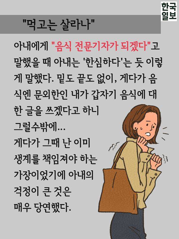 아내에게 “음식 전문기자가 되겠다”고 말했을 때 아내는 ‘한심하다’는 듯 이렇게 말했다. 밑도 끝도 없이, 게다가 음식엔 문외한인 내가 갑자기 음식에 대한 글을 쓰겠다고 하니 그럴 수밖에…