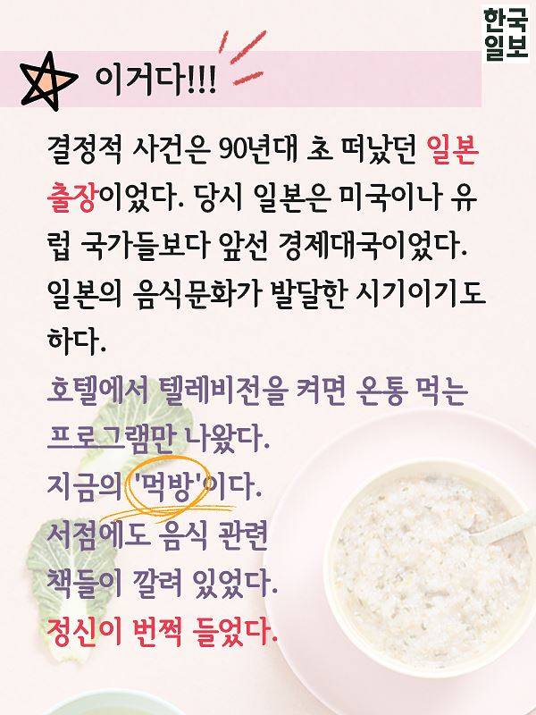 호텔에서 텔레비전을 켜면 온통 먹는 프로그램만 나왔다. 지금의 ‘먹방’이다. 서점에도 음식 관련 책들이 깔려 있었다. 정신이 번쩍 들었다.