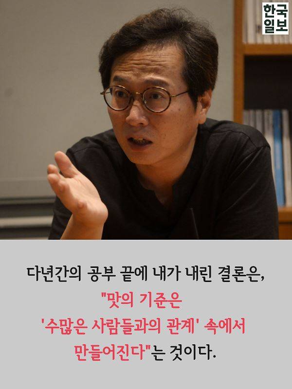 음식을 공부하면서 인간에 대해 깊이 연구하게 됐고, 그러다 보니 한국사회가 보였다. 혹자는 내 정치적 발언을 걱정하기도 한다. 그러나 소신을 두려워해선 안 된다. 사회적 관계 속에서 ‘맛에 대한 기준’을 만들어 가듯, 인간이 행복을 유지하기 위해선 ‘교류’하는 사회가 돼야 한다.