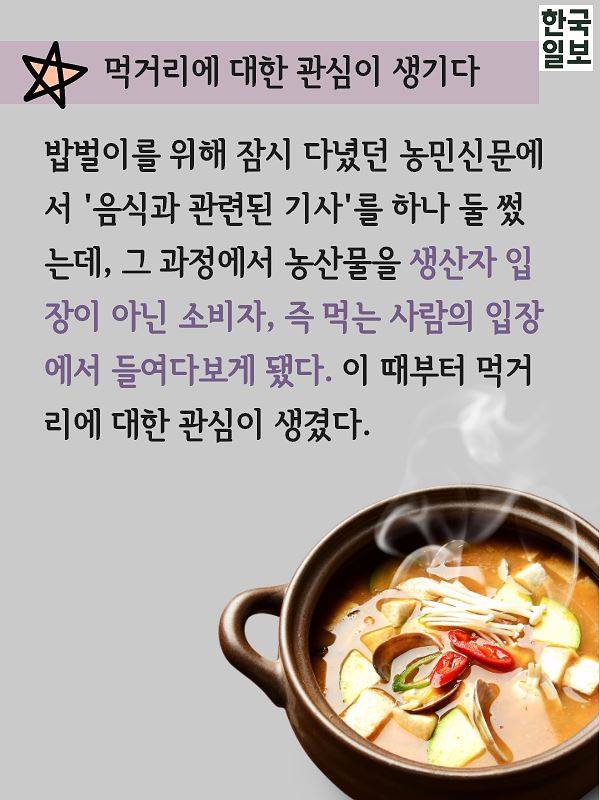 밥벌이를 위해 잠시 다녔던 농민신문에서 ‘음식과 관련된 기사’를 하나 둘 썼는데, 그 과정에서 생산자 입장이 아닌 소비자, 즉 먹는 사람의 입장에서 들여다보게 됐다. 이 때부터 먹거리에 대한 관심이 생겼다.