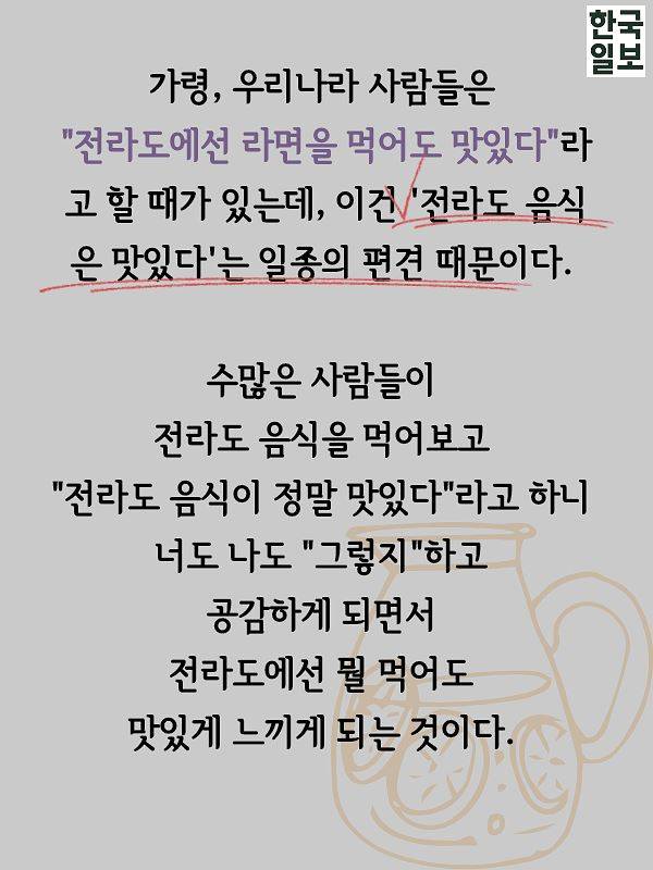 가령, 우리나라 사람들은 “전라도에선 라면을 먹어도 맛있다”라고 할 때가 있는데, 이건 ‘전라도 음식은 맛있다’는 일종의 편견 때문이다. 수많은 사람들이 전라도 음식을 먹어보고 “전라도 음식이 정말 맛있다”라고 하니 너도 나도 “그렇지”하고 공감하게 되면서 전라도에선 뭘 먹어도 맛있게 느끼게 되는 것이다.