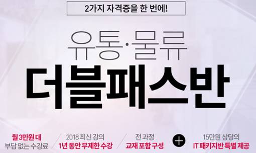 내년 4월에 있을 유통관리사 1회 시험과 7월에 시행될 물류관리사 22회 시험 합격을 목표로 1년 안에 2가지 자격증을 딸 수 있도록 지원하는 커리큘럼이다. 현재 수강신청 시 컴퓨터활용능력, 정보처리기사 등의 IT자격증 패키지도 특별 제공 중이다.