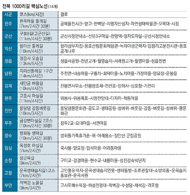 전북도가 최근 아름답고 걷기 좋은 44개 노선, 405km의 길을 ‘전북 1000리길’로 선정했다. 이 가운데 자연 경관이 뛰어나고 접근성이 좋은 14개 핵심 노선도 함께 선정했다. 내년은 전라도라는 이름이 생긴 지 1000년이 되는 해다. 전라도 정도 1000년을 기념해 길을 생태관광과 연계한 인문학적 힐링관광 자원으로 육성하겠다는 포부다.