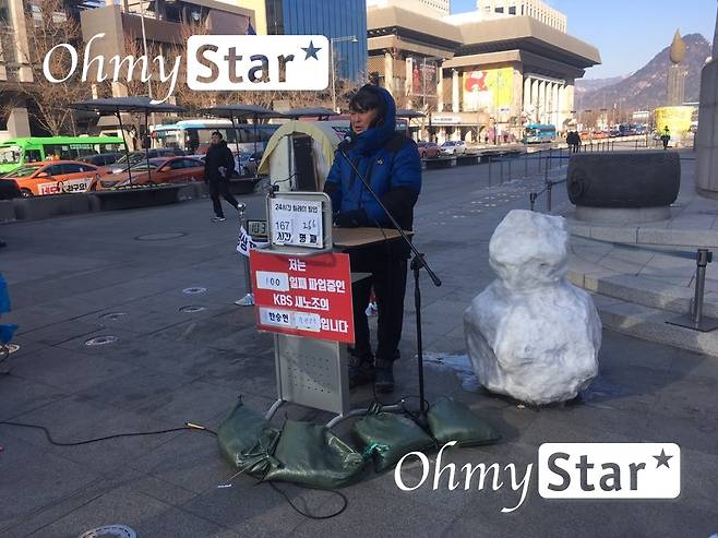 | ▲ 한승현 KBS 촬영감독이 지난 12일 오전 혹한 속에 필리버스터(무제한 발언)를 이어가고 있다. 당시 KBS 총파업은 100일째에 접어든 상황이었다. |