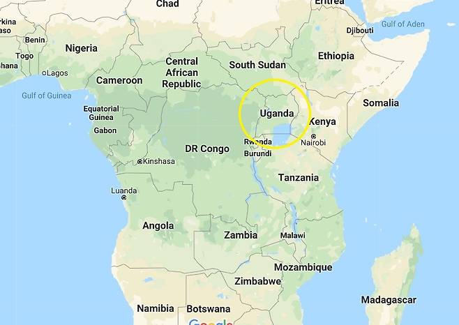 우간다의 한국인 축구 코치 황지석 코치에 대한 이야기를 하기 전에 우간다가 정확히 어디에 위치한 나라인지를 먼저 확인해보자. 위 지도에서 노란색 원 안에 위치한 것이 우간다. 아프리카 대륙 전체로 지도를 확대하면 나라의 이름이 나타나지 않는, 콩고, 케냐, 탄자니아, 남수단에 둘러싸인 나라가 우간다다.