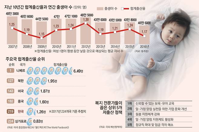 가장 최근 저출산 대책인 ‘2015~2017년 저출산고령사회 기본계획’의 특징도 ‘백화점식 나열’이다. ’일·가정 양립’, ‘결혼·출산·양육부담 경감’에 이어 ‘아동·청소년의 건전한 성장환경 조성’이 포함됐다. 이 대책의 첫 번째가 ‘과속방지턱, 방호울타리 등 어린이 보호구역 시설 정비’였다. 2014년 369곳에서 416곳으로 시설정비 장소를 늘리겠다는 목표를 세웠다. ‘청소년 흡연 예방’, ‘급식 안전을 위한 어린이급식관리지원센터 설치 확대’도 저출산 대책으로 포장했다. 그 결과로 합계출산율(여성 1명이 평생 낳을 수 있는 평균 자녀 수)은 2015년 1.24명에서 지난해 1.17명으로 2009년(1.15명) 이후 최저 수준으로 추락했다.