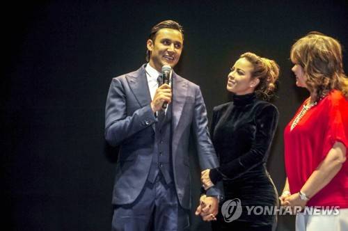 epa06406940 The Costa Rican goalkeeper of Real Madrid, Keylor Navas (L), accompanied by his wife Andrea Salas (C) and journalist Glennda Umana (R), attends the presentation of a movie based on his life on 26 December 2017, in the Pedregal Events Center, in Belen, province of Heredia, Costa Rica. The movie "Hombre de Fe" (Man of Faith) tells his story from childhood in rural Perez Zeledon until today. EPA/Alexander Otarola