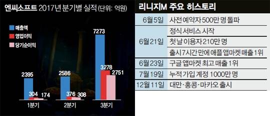 매출을 보면 1분기 2395억원, 2분기 2586억원이던 것이 리니지M이 출시된 뒤 3분기에는 7273억원으로 3배가량 급증했다. 영업이익도 1분기 304억원, 2분기 376억원이던 것이 3분기에는 10배가량 증가한 3278억원을 기록했다. 이대로라면 엔씨소프트의 2017년 연 매출은 2조원을 넘어설 것으로 보인다.