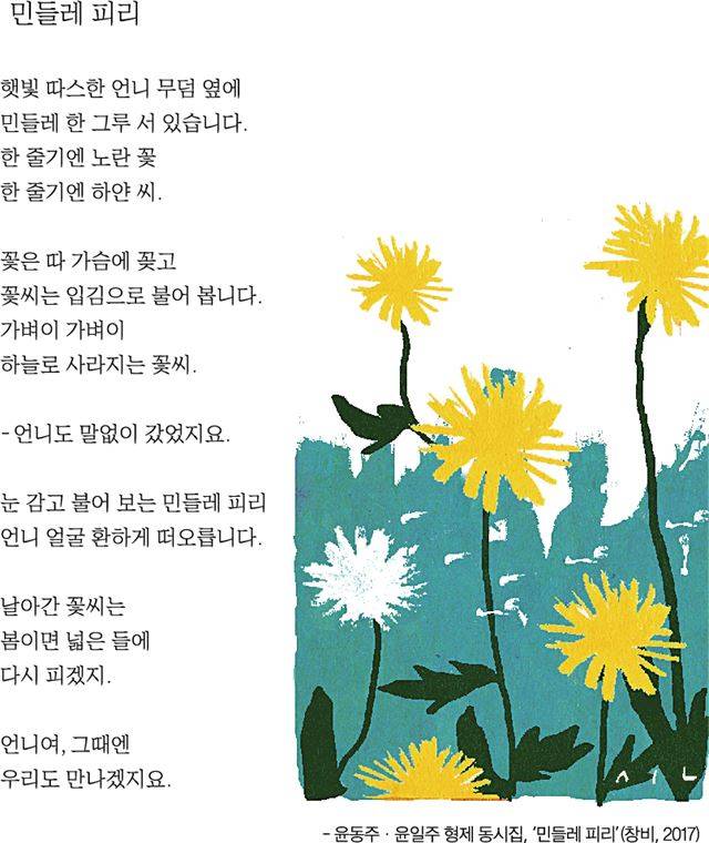 민들레는, 웬만해선 별다른 감흥을 불러일으키기 어려울 정도로 동시에서 익숙한 소재지만 이 시 ‘민들레 피리’는 조금 각별하다. 윤일주 시인(1927-1985)이 친형 윤동주 시인(1917-1945)을 그리며 쓴 시이기 때문이다. 치안유지법 위반으로 수감 중 후쿠오카 형무소에서 원인 불명으로 세상을 떠난 윤동주 시인을 떠올린다면 “언니도 말없이 갔었지요”라는 한 문장이 과연 얼마만한 슬픔과 안타까움을 담고 있을지 짐작하기 힘들다.