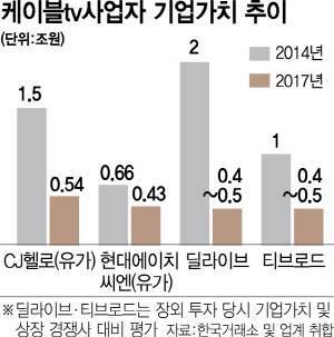 IMM PE는 2014년 JNT인베스트먼트와 컨소시엄을 구성해 2,000억원 규모로 티브로드의 상장 전 지분투자(프리IPO)를 한 바 있다. 컨소시엄은 티브로드 지분 20.13%를 보유한 2대주주다. 투자 당시 티브로드 기업가치 평가 가격은 약 1조원으로 상장 시 기업가치가 1조원 이상이 돼야 컨소시엄의 자금 회수가 가능하다. 하지만 현재 적정 기업가치 수준은 투자 당시보다 50% 가까이 하락했다. 케이블TV 업계 1위 사업자 CJ헬로의 시가총액은 유가증권시장에서 28일 종가 기준으로 약 5,400억원 규모에 그치고 있다.