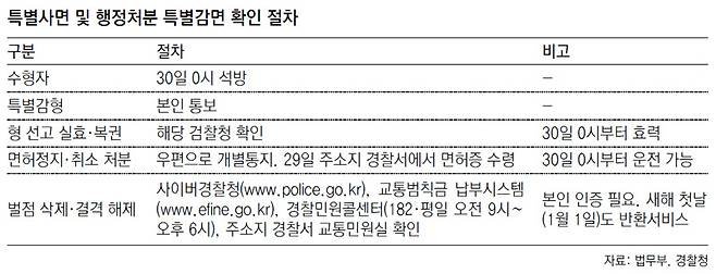 면허 정지·취소 처분 철회 대상은 우편으로 개별 통지된다. 면허증은 주소지 경찰서에서 돌려받을 수 있다. 단, 실제 운전은 30일 0시부터 가능하다. 경찰은 편의를 위해 연휴인 30일부터 내년 1월 1일까지 업무시간 때 면허증 반환 서비스를 제공한다.