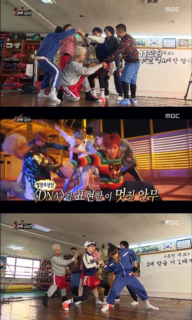 멤버들이 각자 지드래곤, 워너원 등 노래로 테스트에 임한 가운데 양세형은 방탄소년단 'DNA'로 훈련했다. 양세형을 위해 무한도전 멤버들은 방탄소년단의 안무를 함께 선보였다. 그러나 방탄소년단과는 사뭇 다른 낙지 같은 꿀렁거림으로 웃음을 자아냈다. (사진=MBC '무한도전' 캡처)