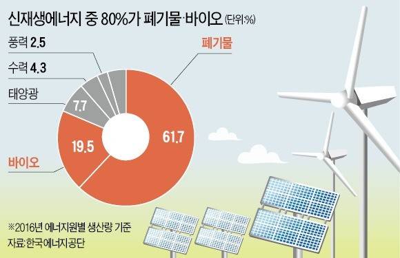 [ 이태훈 기자 ] 정부는 태양광과 풍력 위주로 신재생에너지를 늘리겠다고 공언했지만 국내 신재생에너지의 80% 이상은 폐기물과 폐목재를 태워 생산되는 것으로 나타났다. 이들 에너지원은 쓰레기 등을 재활용한다는 장점이 있으나 각종 오염물질을 배출해 친환경과는 거리가 멀다는 지적을 받는다.
