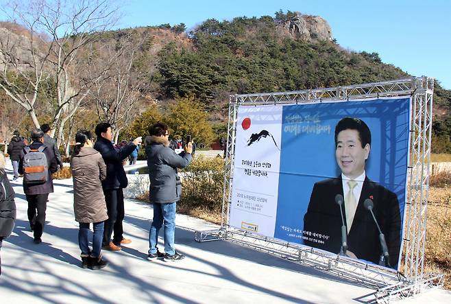 또 묘역 입구에는 고 노무현 전 대통령이 2006년 1월 '신년 연설회' 장면을 담은 대형 사진이 설치돼 있었고, 시민들은 휴대전화로 사진을 찍기도 했다.