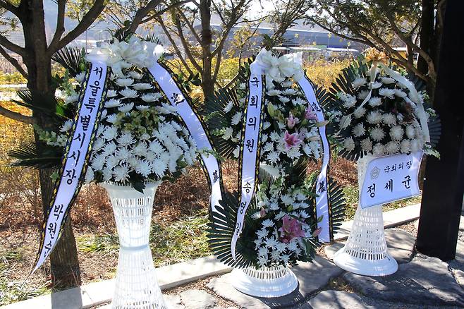 | ▲ 1일 고 노무현 전 대통령 묘역에 정세균 국회의장과 송영길 국회의원, 박원순 서울특별시장이 보낸 조화가 놓여 있다. |