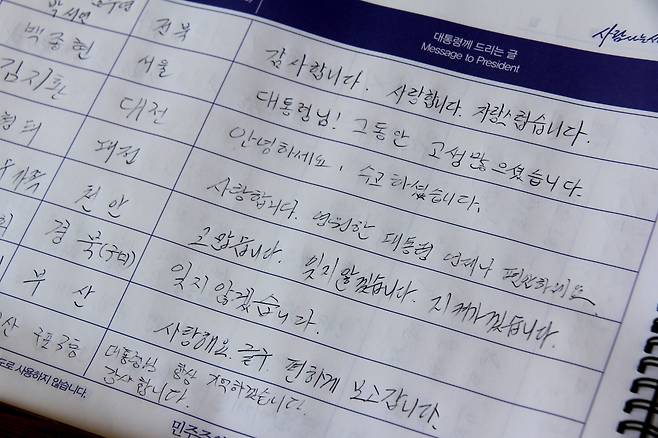 참배객들은 방명록에 "대통령님 사람사는 세상을 이루겠습니다. 사랑합니다" 등 다양한 글을 남기고 있다.