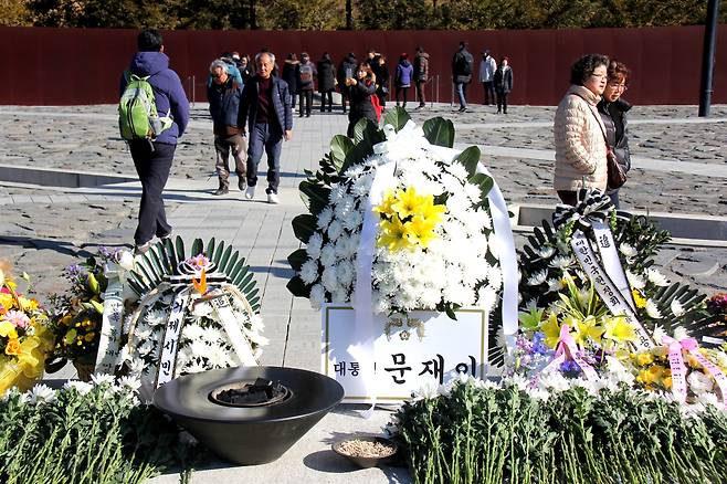 새해 첫날, 노무현 묘소에 문 대통령 등 조화 수북이