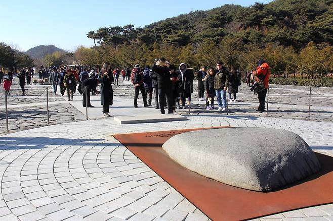| ▲ 1일 노무현 전 대통령 묘역을 참배한 시민들이 사진을 찍고 있다. |