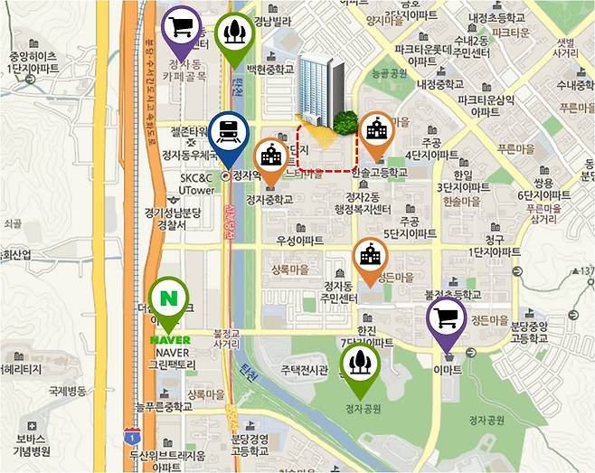 지하철 분당선·신분당선 환승역인 정자역이 단지 바로 앞에 있다. 정자역을 중심으로 카페골목, 각종 음식점, 병원 등 근린생활시설이 자리한다. 네이버 본사인 그린팩토리와 KT 분당 본사도 차량 10분 거리에 있어 관련 종사자들의 배후 주거지로도 적절하다. 교육시설로는 단지 내 신기초, 정자중, 유치원 2개소 등이 있고 백현중, 분당고, 한솔고, 분당중 등이 가깝다.