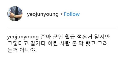 이어 "준아, 군인 월급 적은 거 알지만 그렇다고 길가다 어린 사람 돈 막 뺏고 그러는 거 아니야"라는 글을 남겼다.
