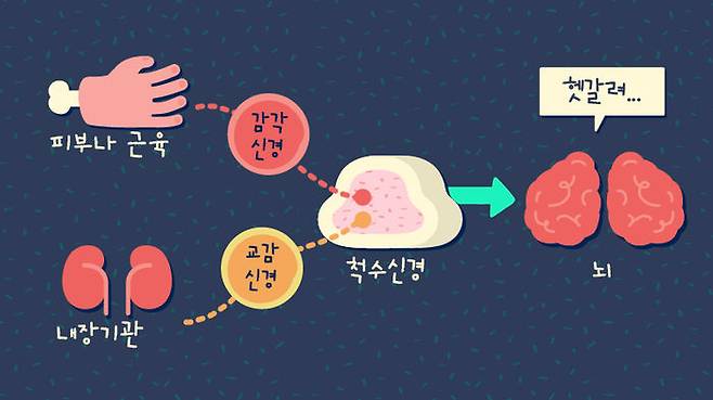 연관통이란, 말 그대로 기관 간의 착각으로 인해 느껴지는 통증입니다. 연관통이 발생하는 이유가 명확하게 밝혀지지는 않았지만 이를 설명할 몇 가지 가설들이 있습니다. 우리 몸 구석구석에는 많은 신경이 분포돼 있는데요. 피부나 근육 등에 생기는 통증은 감각신경을 통해 뇌에 전달되고 우리는 뇌에서 보내는 신호를 통해 아픔을 느끼게 됩니다.