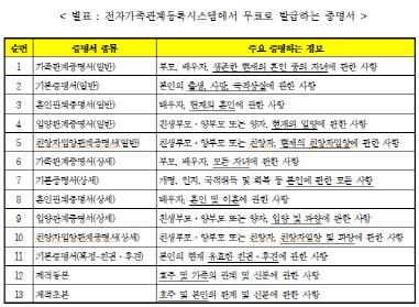 전자가족관계등록시스템에서는 가족관계증명서와 제적등본 등 13종의 증명서를 인터넷으로 발급할 수 있는 서비스다. 공인인증서를 통해 본인확인절차를 마치면 증명서를 무료로 받을 수 있다.