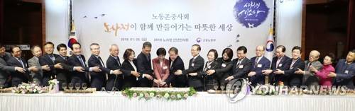 (서울=연합뉴스) 김주형 기자 = 김영주 고용노동부 장관과 문성현 노사정위원회 위원장, 김주영 한국노총 위원장 등 참석자들이 5일 오후 서울 중구 포스트 타워에서 열린 '2018 노사정 신년인사회'에서 축하 떡 케이크 절단을 하고 있다.